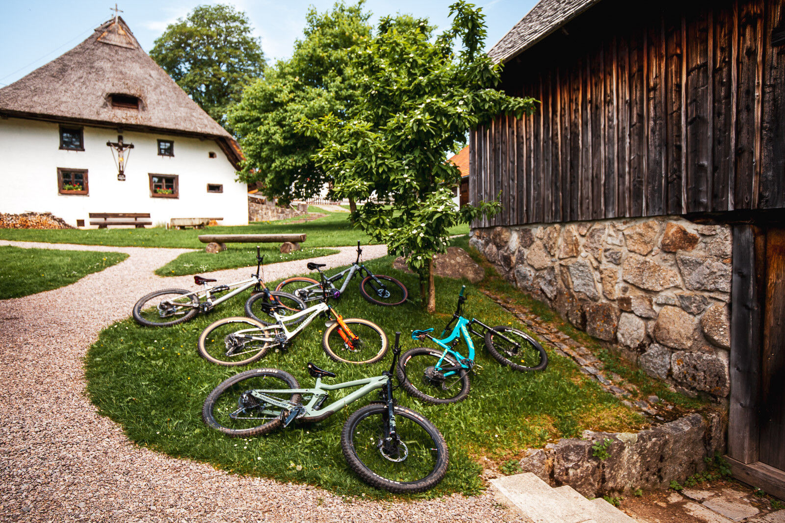 Vom Rathausin Herrischriedfolgen wir der Hauptstraße kurz nachSüden und biegen sogleich halblinks in die Talstraße ein, die unszum südlichen Ortsrand führt, wo wir die Hauptstraße (K6533)überqueren. Gegenüber nimmt uns die Niedergebisbacher Straße auf,die in moderater Steigung die Häuser von Lochmattansteuert. Auf derAnhöhe vor Niedergebisbach verlassen wir die recht breiteAsphaltstraße und biegen rechts auf einen Weg ab, der zunächst imBereich des Waldrands zu einem nahen Abzweig leitet. Nun nach rechtsin den Wald hinein und weiterhin mäßig ansteigend auf Schotterwegenzum Kehltannenlift. Die Passage zum Ödlandlifterfolgt auf einemetwas schmalerem Waldweg. Bei den Liftanlagen genießen wir herrlicheAusblicke über die Umgebung, u.a. auf Herrischried und dieHotzenwaldhöhen. Schließlich biegen wir scharf links ab underreichen den Rankholzplatz, wo sich die Möglichkeit bietet, injeweils kurzen Abstechern das Hornbergbecken und die Ödlandkapelleaufzusuchen. Am Rankholzplatz schwenken wir rechter Hand auf denÖdlandweg ein, passieren die Schutzhütte und zweigen bald nachlinks auf das Gemeindesträßle ab, welches uns in die Wehrhaldenführt. Die baumbestanden Talflanken über dem tief eingeschnittenenWehratal bestimmen den nächsten Abschnitt. Unser Schotterweg leitetmit gelegentlichen Auf-und Abpassagen zur Wegkreuzung Bei derKreuzbuche, die gelben Mountainbikemarkierungen weisen die richtigeRoute. Nach der Kreuzbuche wechseln wir rasch in offene Feldflur undsteuern die Häuser von Großherrischwandmit dem sehenswertenKlausenhofan. Auf dem Quellenweg verlassen wir den Ort wieder,umrunden eine Anhöhe und gelangen in einer kurzen Wiesenabfahrt zueinem Bach. Im Gegenhang wartet die einzige anspruchsvollere Passagedes Tages: ein wurzeliger Pfad erklimmt eine Steilstufe, die imZweifel zu Fuß genommen wird. Oben angekommen halten wir uns amWaldrand kurz links, dann halbrechts und erreichen in einem weitenRechtsbogen wieder die Ortsmitte von Herrischried.