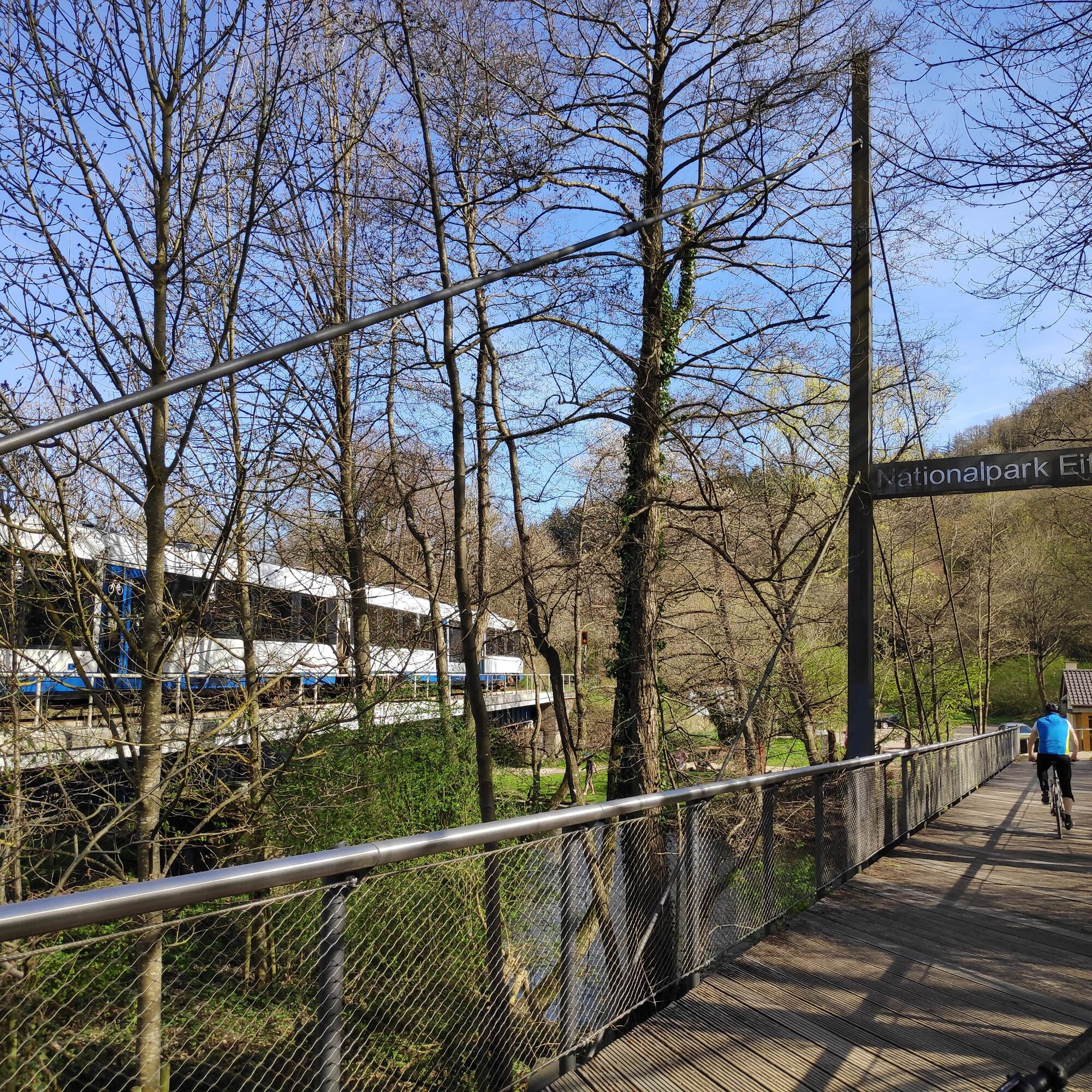 Für die Navigation zum kostenlosen Parkplatz "Auel" am Bahnhof Zerkall gib "Auel 1, 52393 Hürtgenwald" ins Navi ein. Eine Brücke führt dich vom Parkplatz über die Rur zum Bahnsteig.